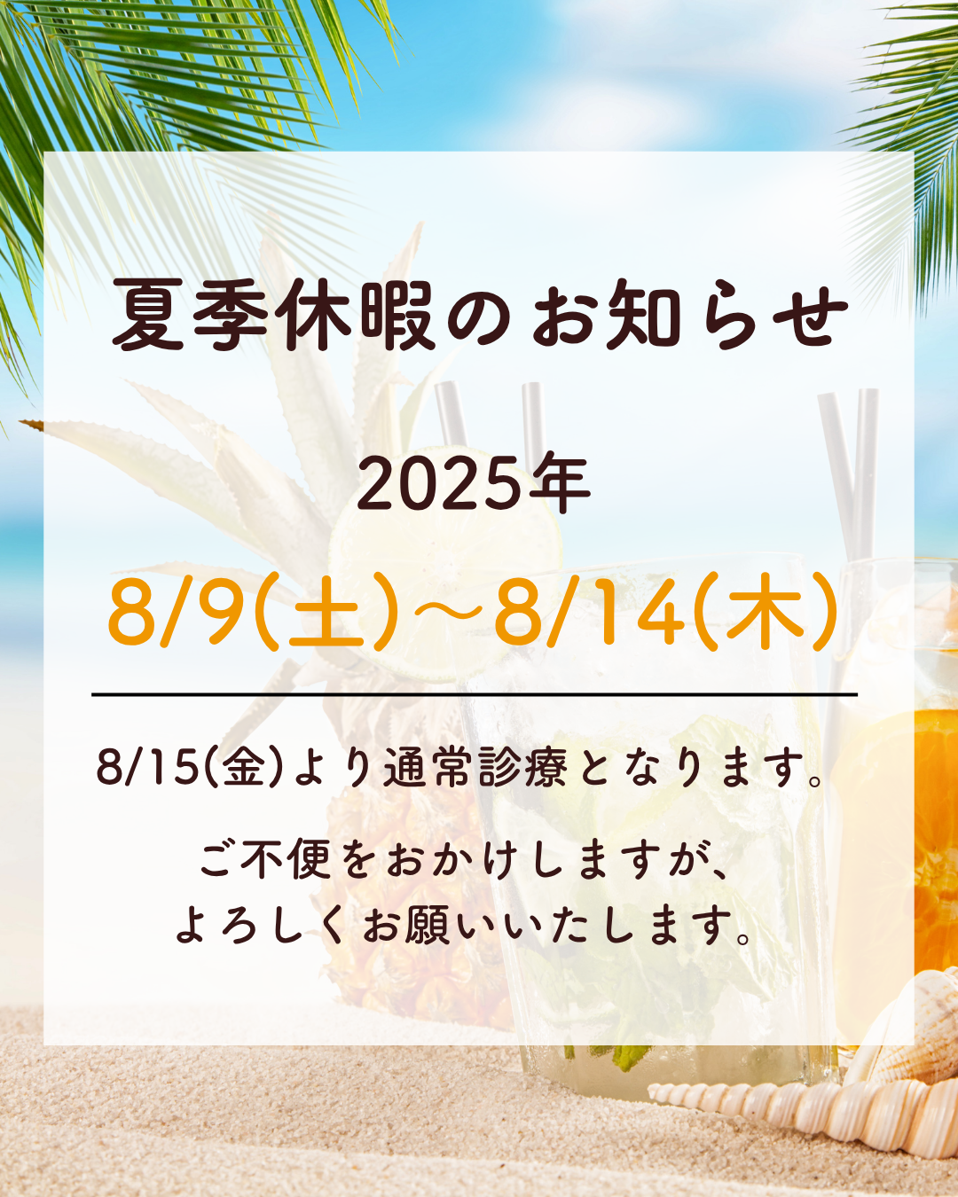 Top 当院について 診療科目 初めての方へ スタッフ 設備紹介 料金表 アクセス 最新情報 Top 当院について 診療科目 予防歯科 子ども歯科 マタニティ歯科 むし歯・歯周病治療 補綴・修復について 専門治療 矯正歯科 初めての方へ スタッフ 設備紹介 料金表 アクセス 最新情報 048-729-6483 BLOG最新情報 夏季休診のお知らせ 2025年07月25日 [未分類, 診療時間のお知らせ] 8月の夏季休暇のお知らせです。 8/9(土)~8/14(木) 上記期間は休診とさせていただきます。 ご迷惑をおかけいたしますが、 何卒よろしくお願い申し上げます。 < 前の記事へ 次の記事へ > ■最近の記事 2月の診療時間のお知らせ 2026年の新習慣。歯科医院を「マイナスをゼロにする場所」から「プラスを積み上げる場所」へ 年始のご挨拶 1月の診療時間のお知らせ 年末年始休業のお知らせ ■カテゴリー ケア用品紹介 セミナー・イベント情報 ブルーラジカルP-01について ブログ 学会・セミナー 新型コロナウイルスに関するお知らせ 新着情報 未分類 診療時間のお知らせ ■月別 2026年1月 2025年12月 2025年11月 2025年10月 2025年9月 2025年8月 2025年7月 2025年6月 2025年5月 2025年4月 2025年3月 2025年2月 2025年1月 2024年12月 2024年11月 2024年10月 2024年9月 2024年8月 2024年7月 2024年6月 全月別