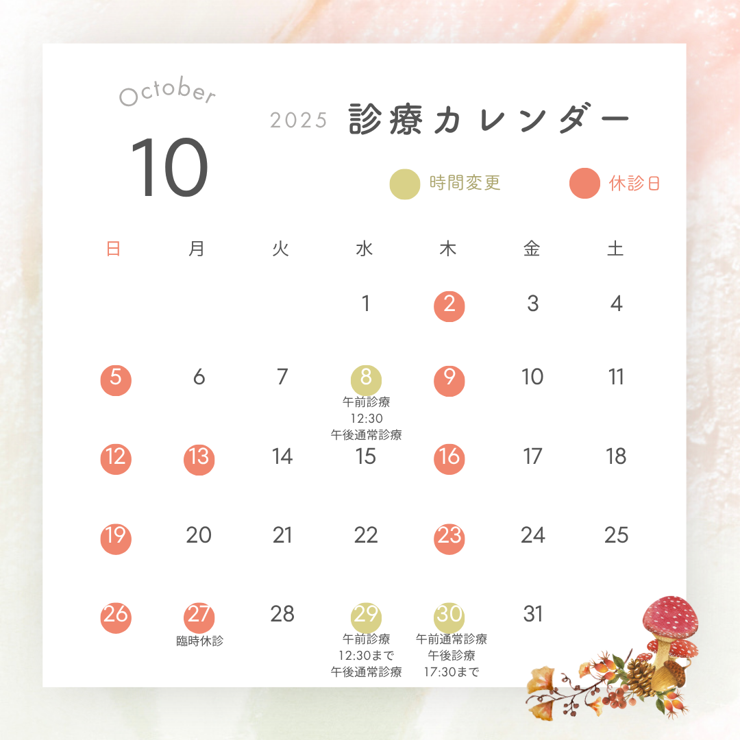 10月30日(木)診療します 9:00−17:30(最終診察17:00 )