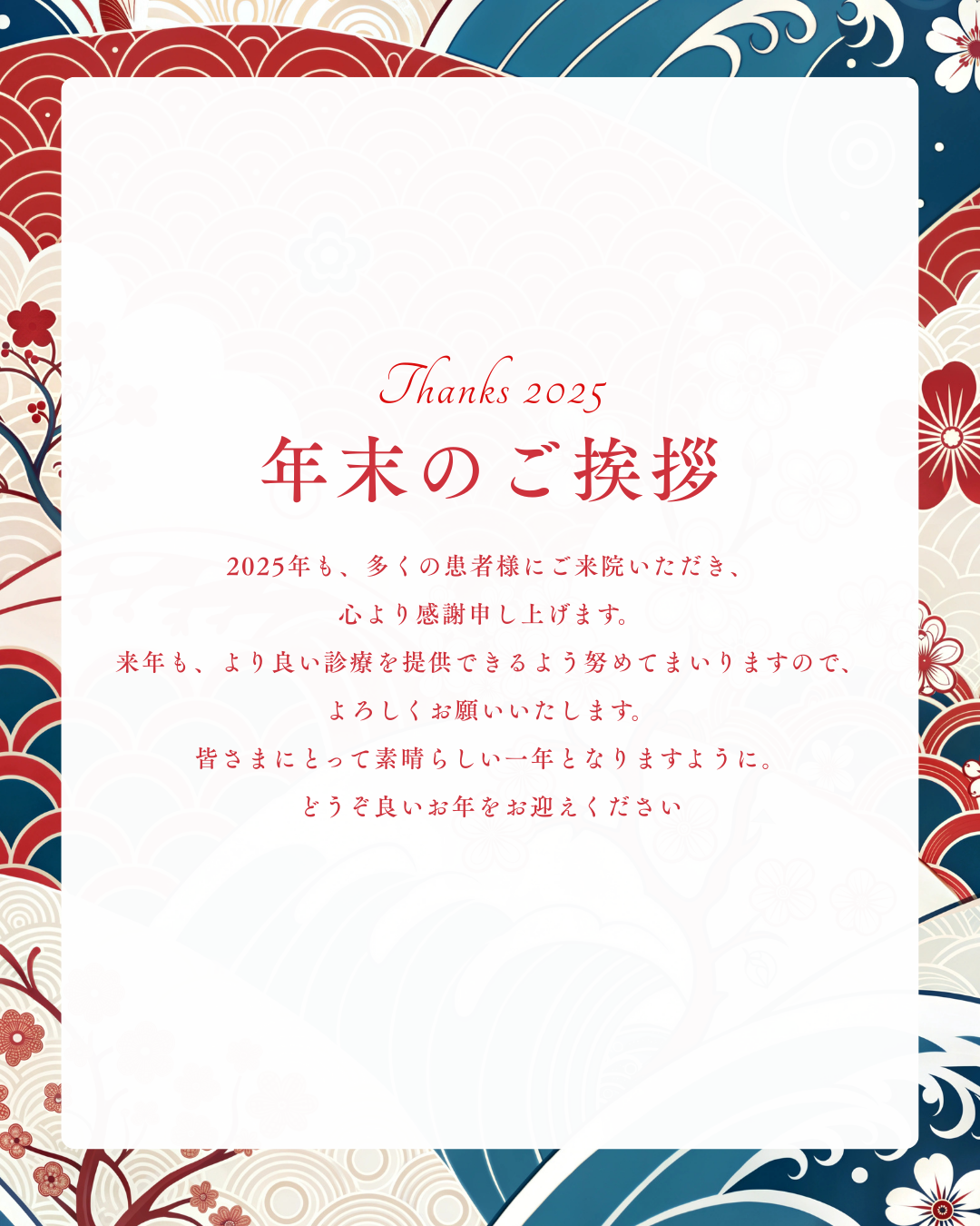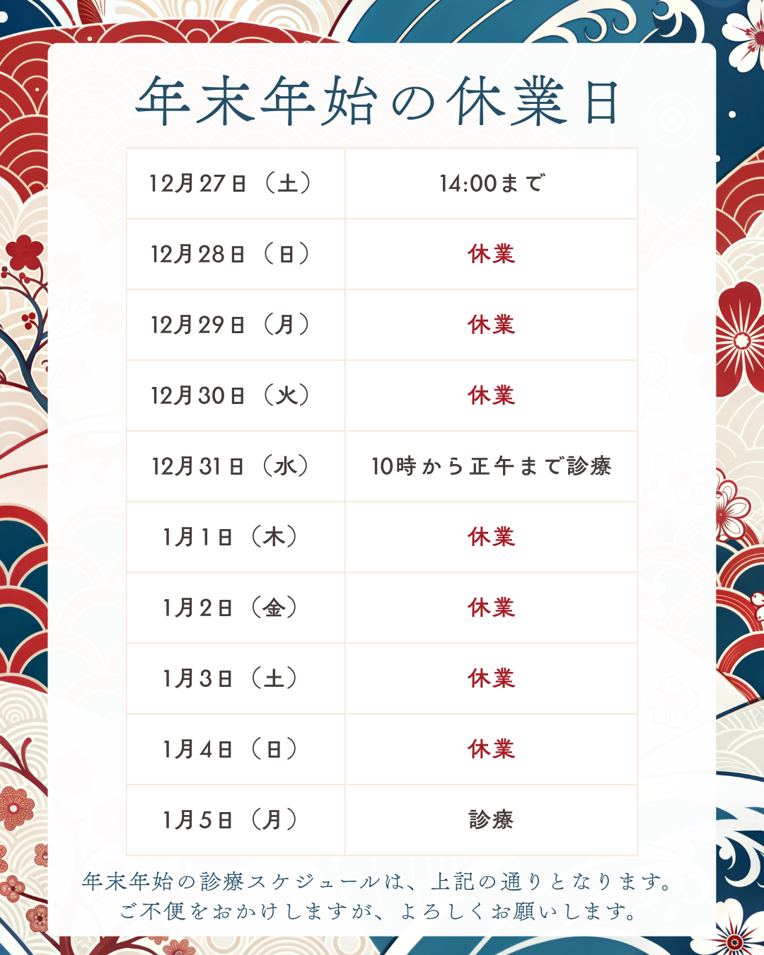 Top 当院について 診療科目 初めての方へ スタッフ 設備紹介 料金表 アクセス 最新情報 Top 当院について 診療科目 予防歯科 子ども歯科 マタニティ歯科 むし歯・歯周病治療 補綴・修復について 専門治療 矯正歯科 初めての方へ スタッフ 設備紹介 料金表 アクセス 最新情報 048-729-6483 BLOG最新情報 年末年始休業のお知らせ 2025年12月19日 [未分類, 診療時間のお知らせ] いつもページデンタルクリニックに ご来院いただき、誠にありがとうございます。 年末年始のお知らせです。 12月27日(土)14:00まで~1月4日(日) 休診 ※今年度、歯科医師会 年末年始の当番医院により 12月31日(水)10時から正午までは診療 皆様にはご不便をおかけいたしますが、 何卒ご理解のほど、よろしくお願い申し上げます。 皆様どうぞ、素敵な年末年始をお過ごしください。 < 前の記事へ 次の記事へ > ■最近の記事 年始のご挨拶 1月の診療時間のお知らせ 年末年始休業のお知らせ 削らず守る⽇本の知恵 ――やさしさから⽣まれた「サホライド®」のおはなし 12月の診療時間のお知らせ ■カテゴリー ケア用品紹介 セミナー・イベント情報 ブルーラジカルP-01について ブログ 学会・セミナー 新型コロナウイルスに関するお知らせ 新着情報 未分類 診療時間のお知らせ ■月別 2026年1月 2025年12月 2025年11月 2025年10月 2025年9月 2025年8月 2025年7月 2025年6月 2025年5月 2025年4月 2025年3月 2025年2月 2025年1月 2024年12月 2024年11月 2024年10月 2024年9月 2024年8月 2024年7月 2024年6月 全月別